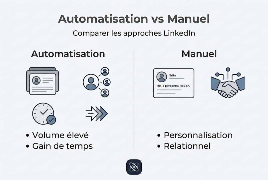 - Automatisation : rapide, scalable, testable, idéale pour les campagnes larges, mais nécessite des limites d'automatisation LinkedIn strictement respectées