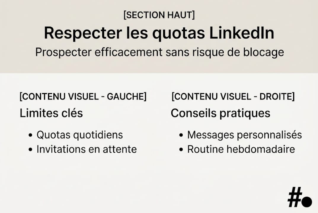 | Comprendre les quotas | Maîtriser les limites LinkedIn permet d’éviter les blocages et d’optimiser sa prospection. |