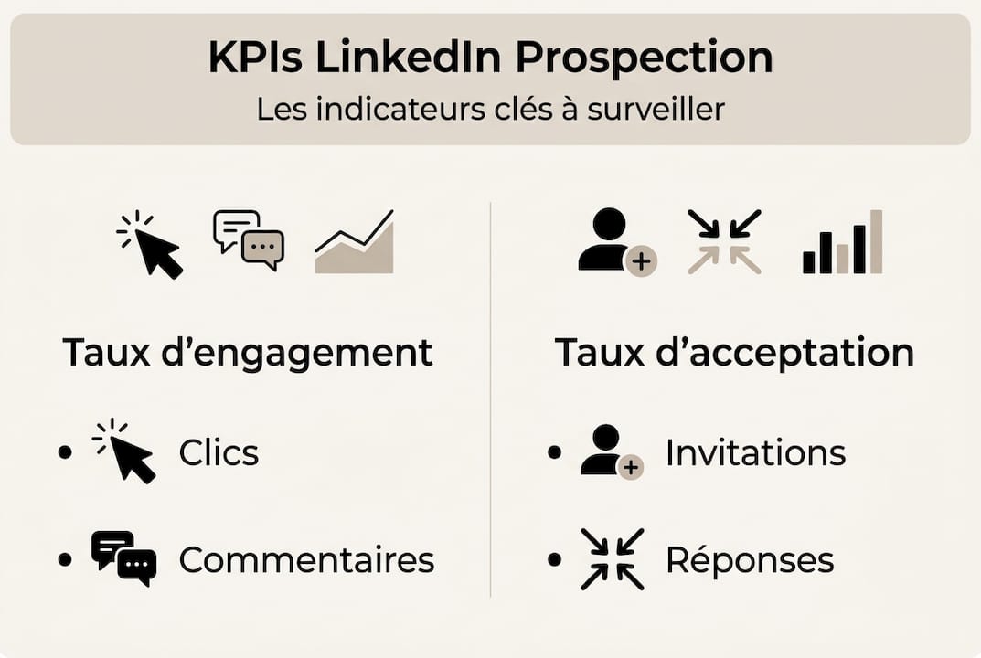 Les vrais KPIs business sont ceux corrélés aux revenus : taux d'acceptation des invitations, taux de réponse aux messages, coût par lead (CPL), taux de conversion, et pipeline influencé. Ces indicateurs racontent l'histoire de votre entonnoir de prospection, pas celle de votre popularité.